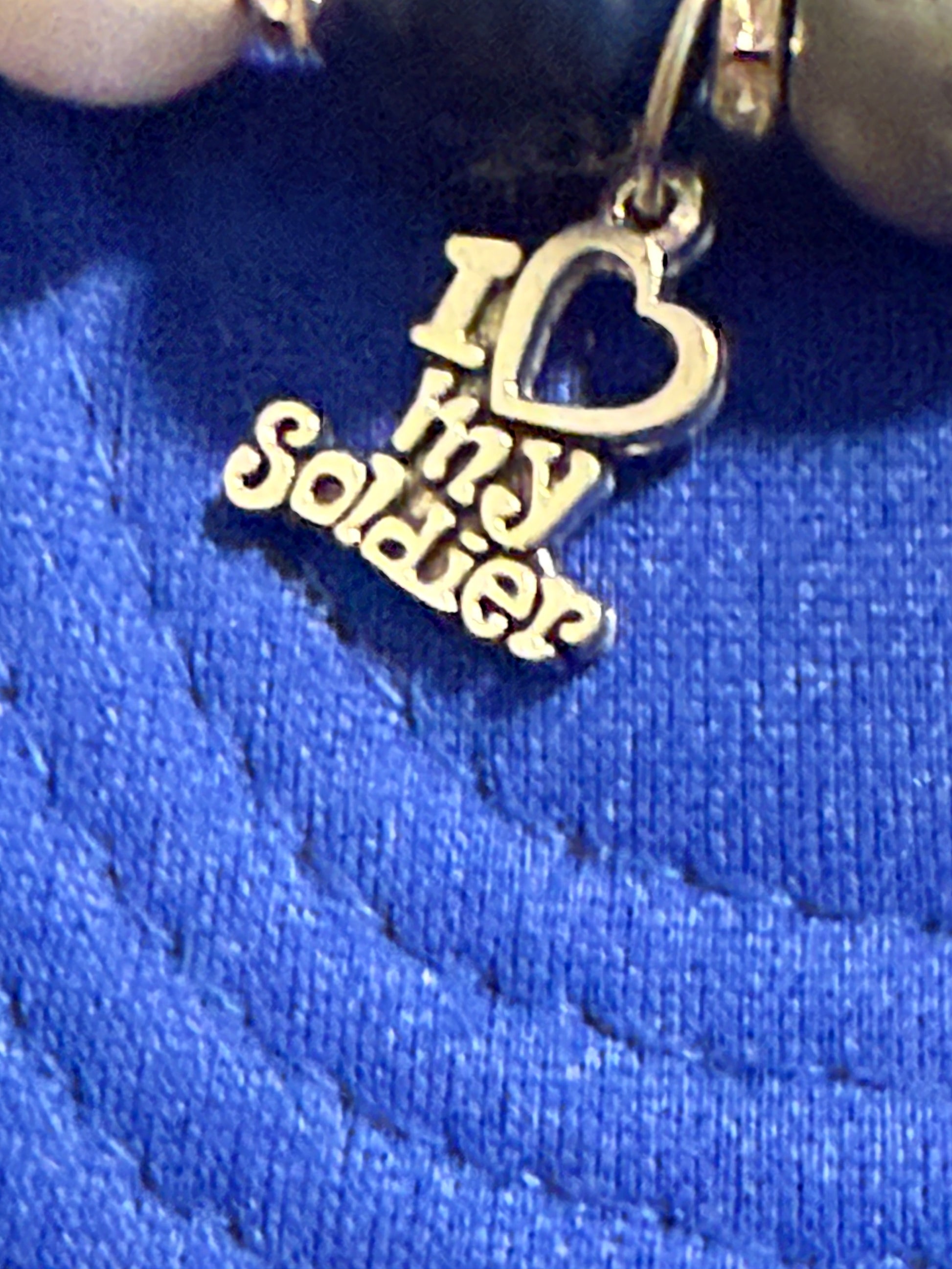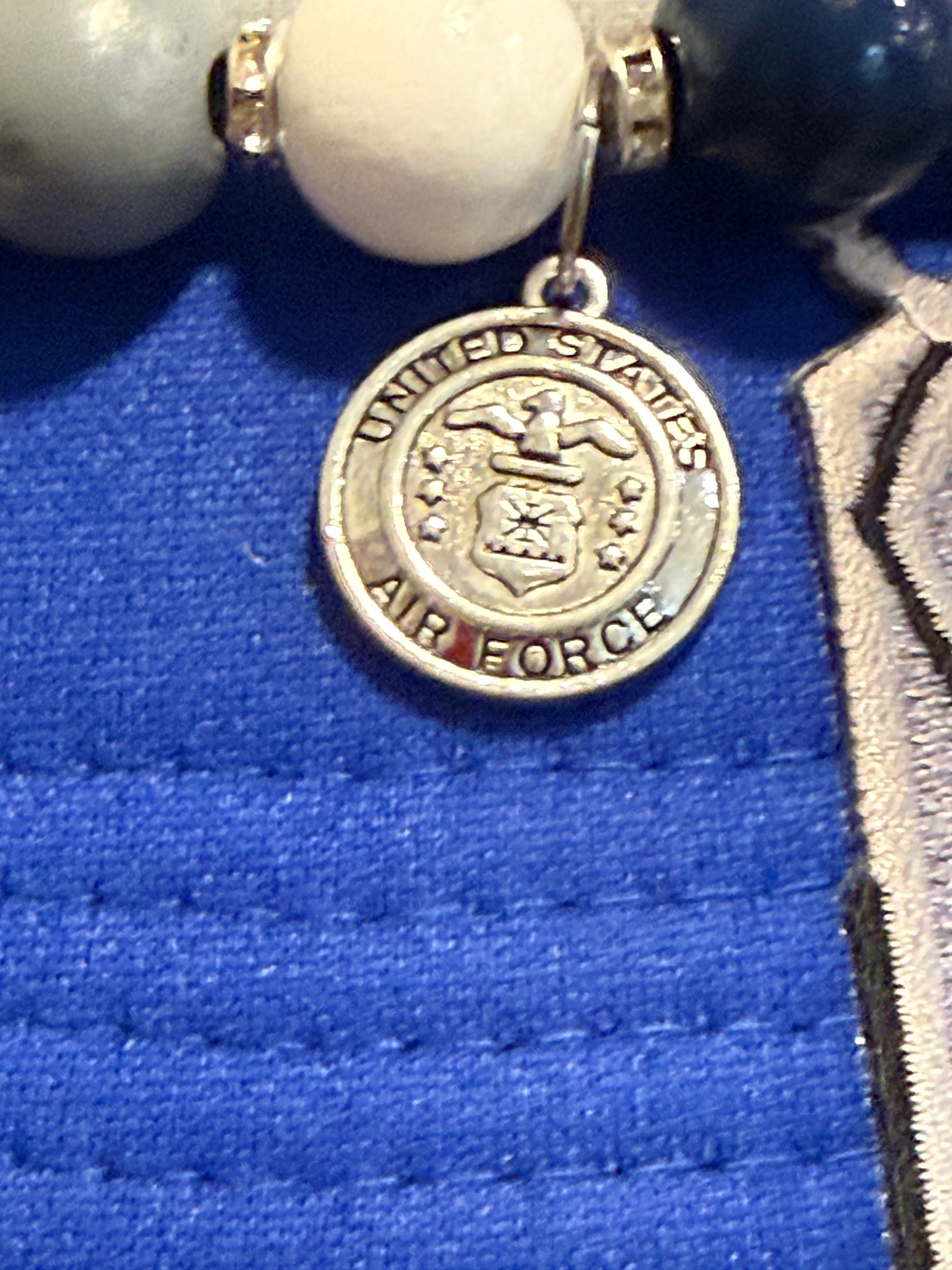 This bold blue and white trucker hat features a striking âAir Force Wifeâ patch, patriotic red white and blue background print, and a custom beaded chain with charms and dog tags on the bill. A statement of love, loyalty, and fierce pride for your hero in uniform.Â