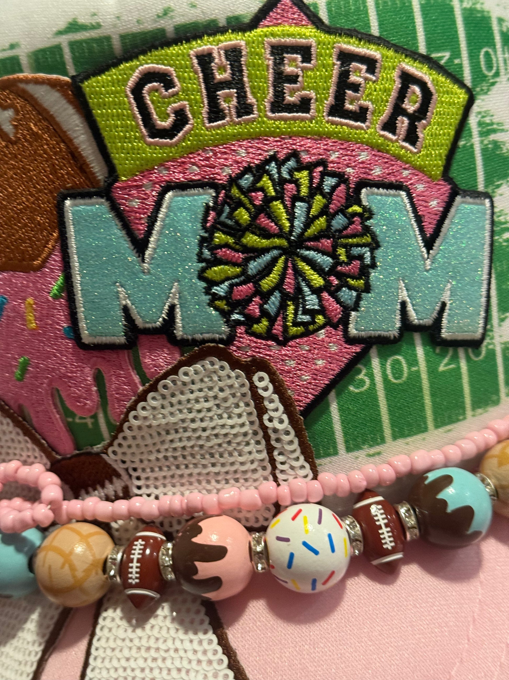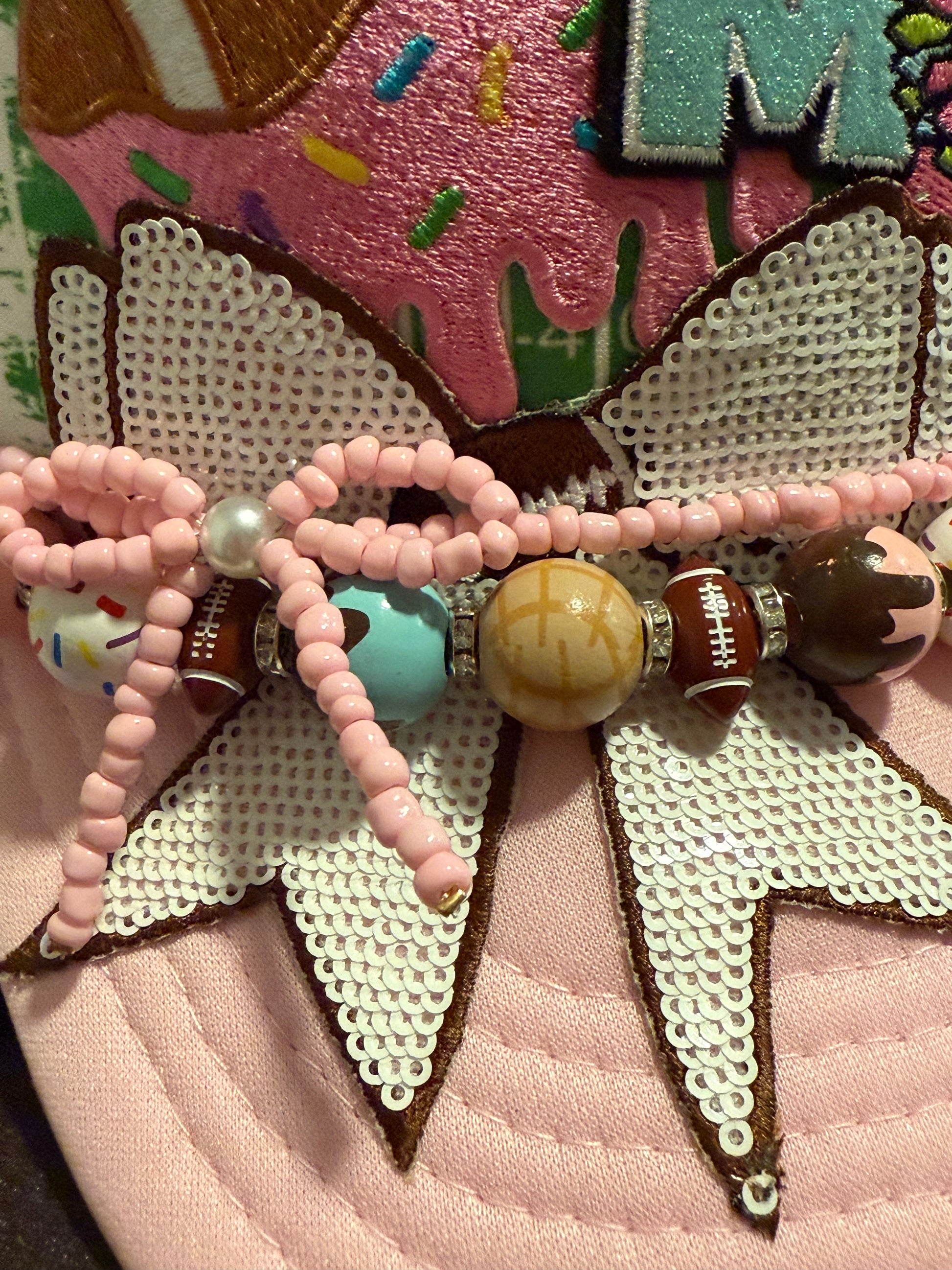 Game day just got a whole lot sweeter đŚđâ¨. This pink and white trucker hat is serving football meets fun with a sprinkle-dipped football patch, bold cheer mom patch with a white sequin bow for that extra attitude. Topped off with a custom beaded drip football chain, and a second pink bow bead chainâbecause why shouldnât your hat be as fun as your tailgate snacks?Â