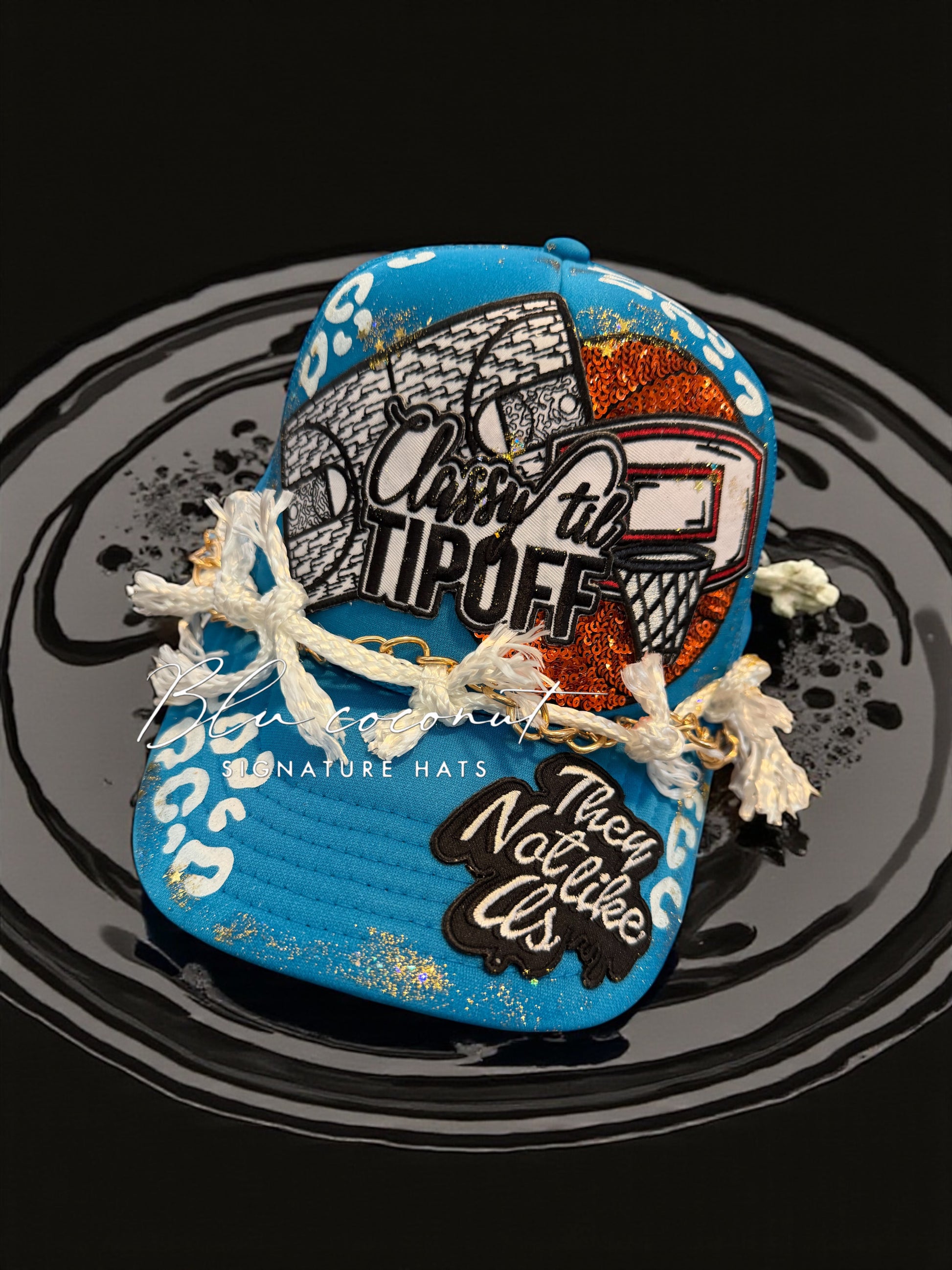 Bring the heat on game day 🔥 This Blu Coconut teal trucker hat mixes hand painted glitter, leopard print and bold energy — finished with a basketball net and gold-chain flair. Perfect for courtside queens and sporty trendsetters!”
