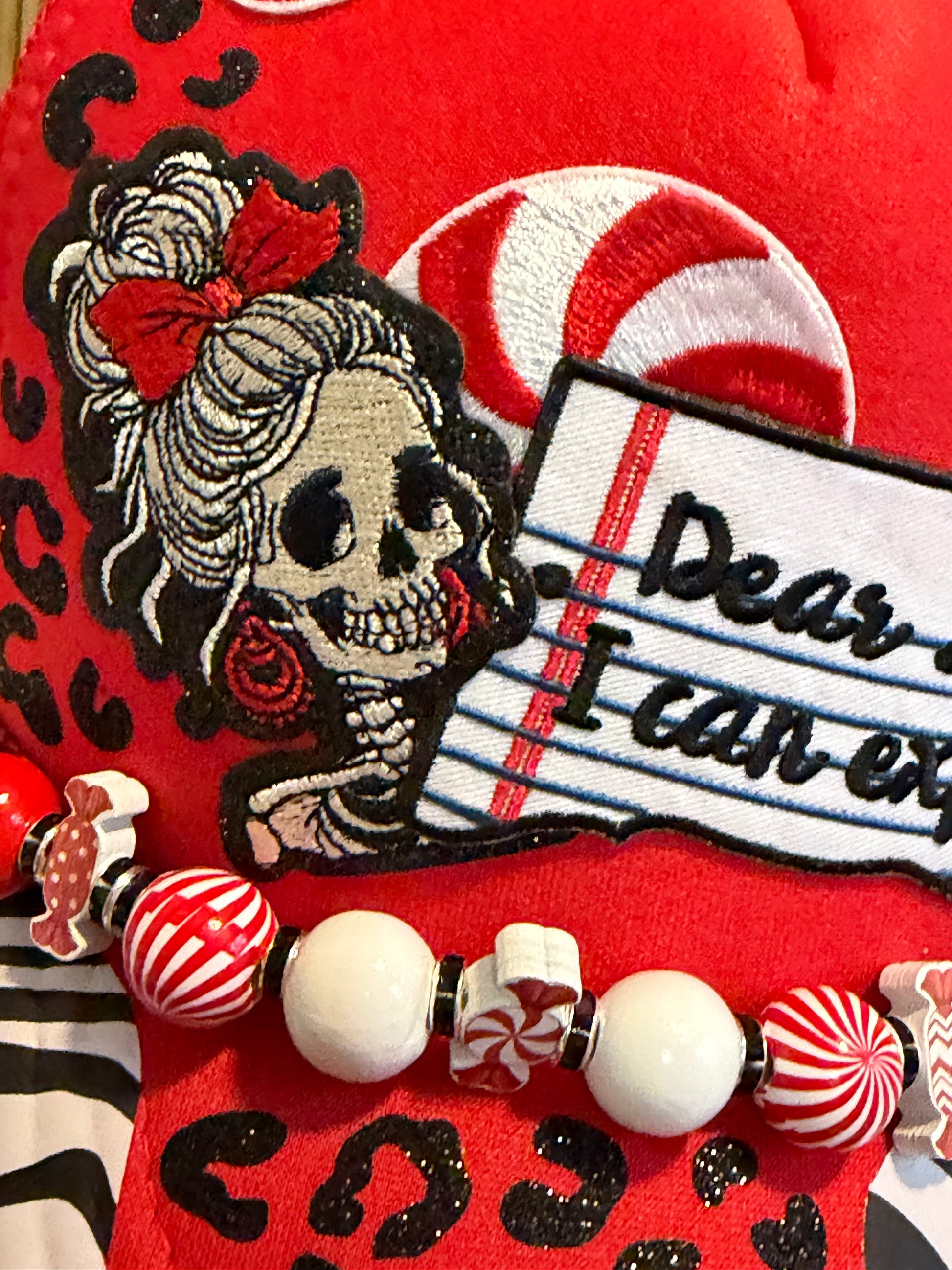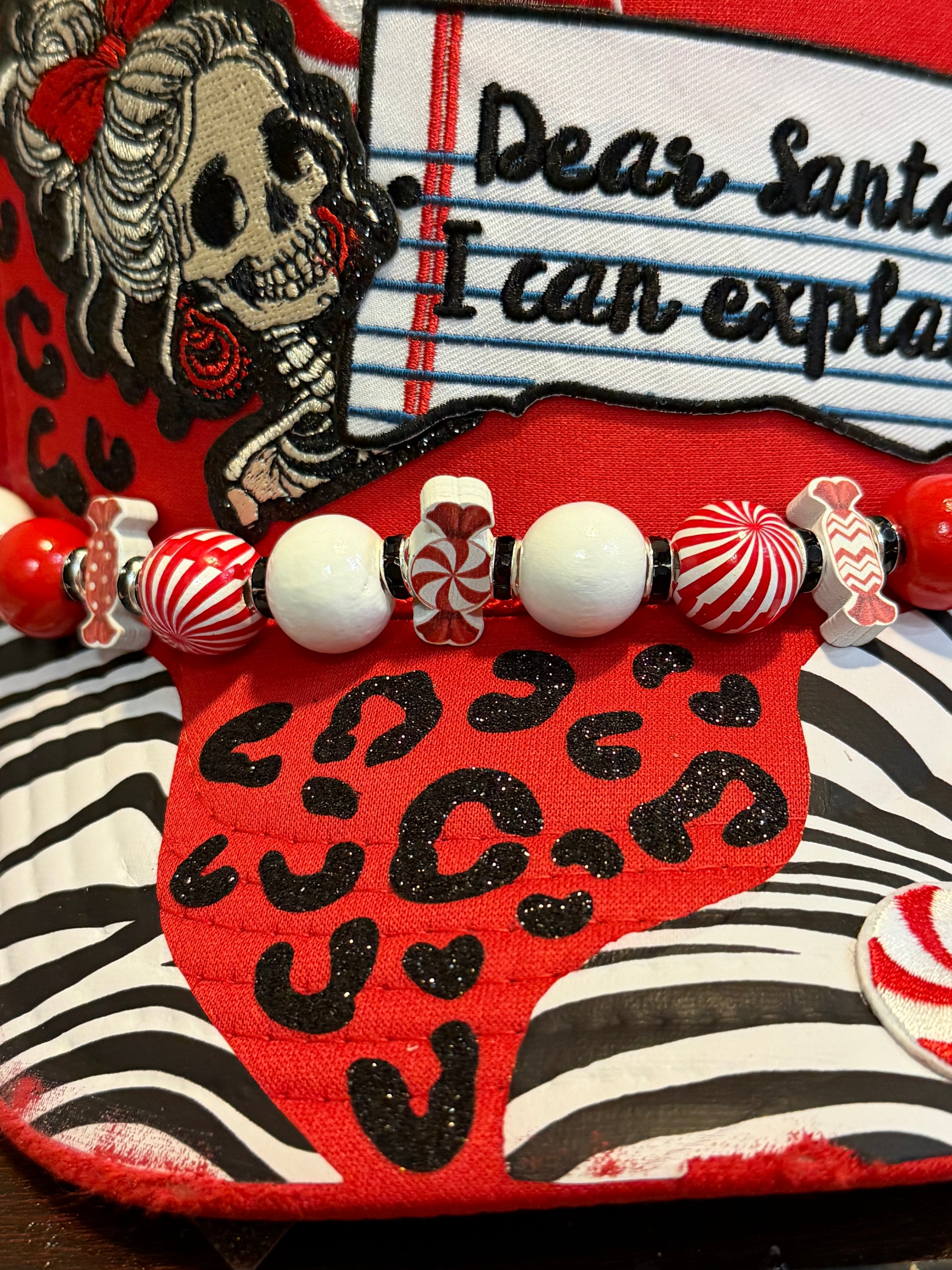 This bold red trucker hat is holiday sass at its best.  Featuring a candy-cane skulls, leopard print accents, and a festive custom chain with peppermint flair — it’s the ultimate statement piece for your naughty-but-fun Christmas season.