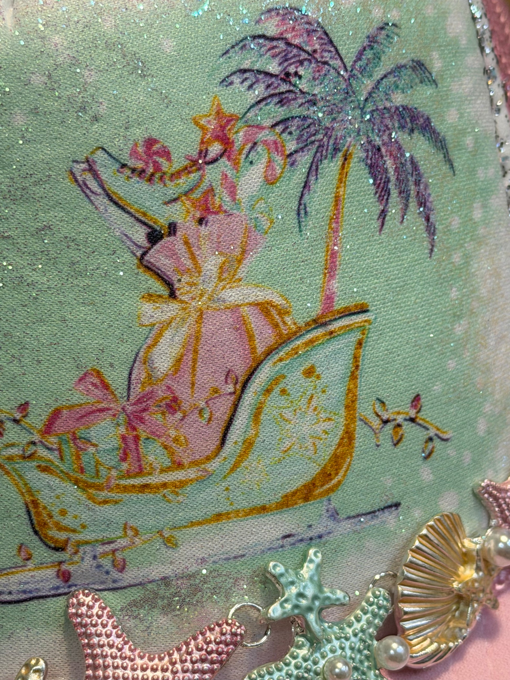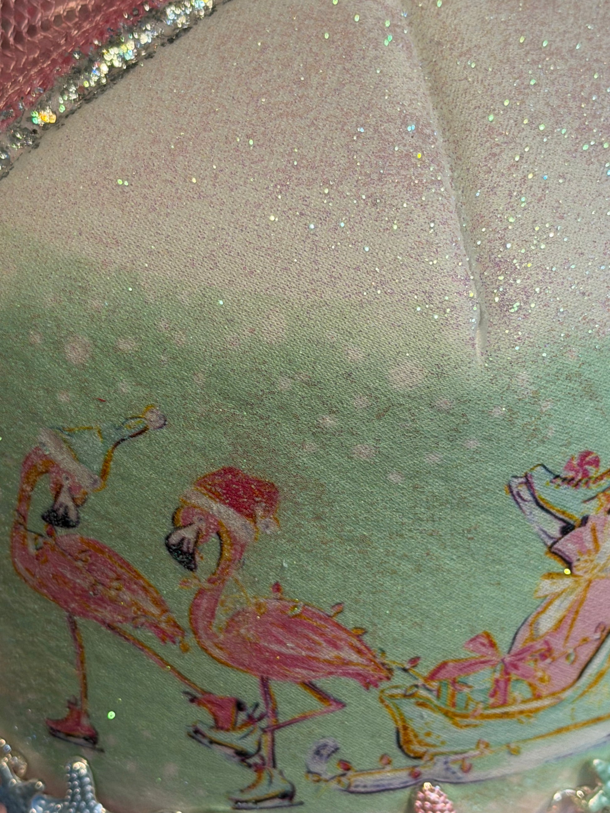 Bring the beach to your holiday season with this Blu Coconut Signature Hat! Featuring sparkling pink flamingos, shimmering mint glitter, shell custom chain, and a touch of hand painted glittery tropical cheer — it’s the perfect mix of beach vibes and Christmas sparkle.