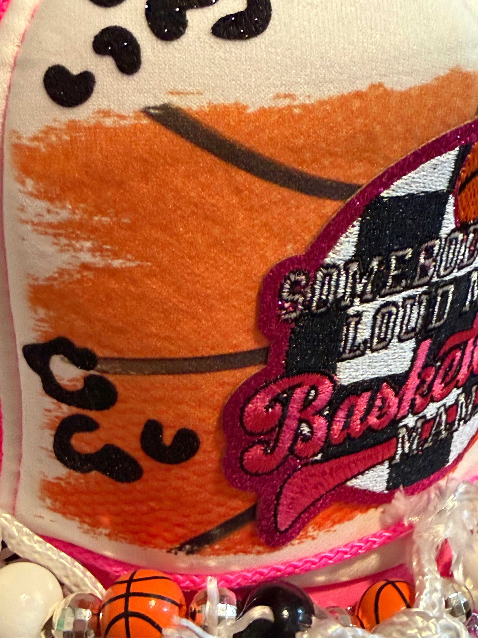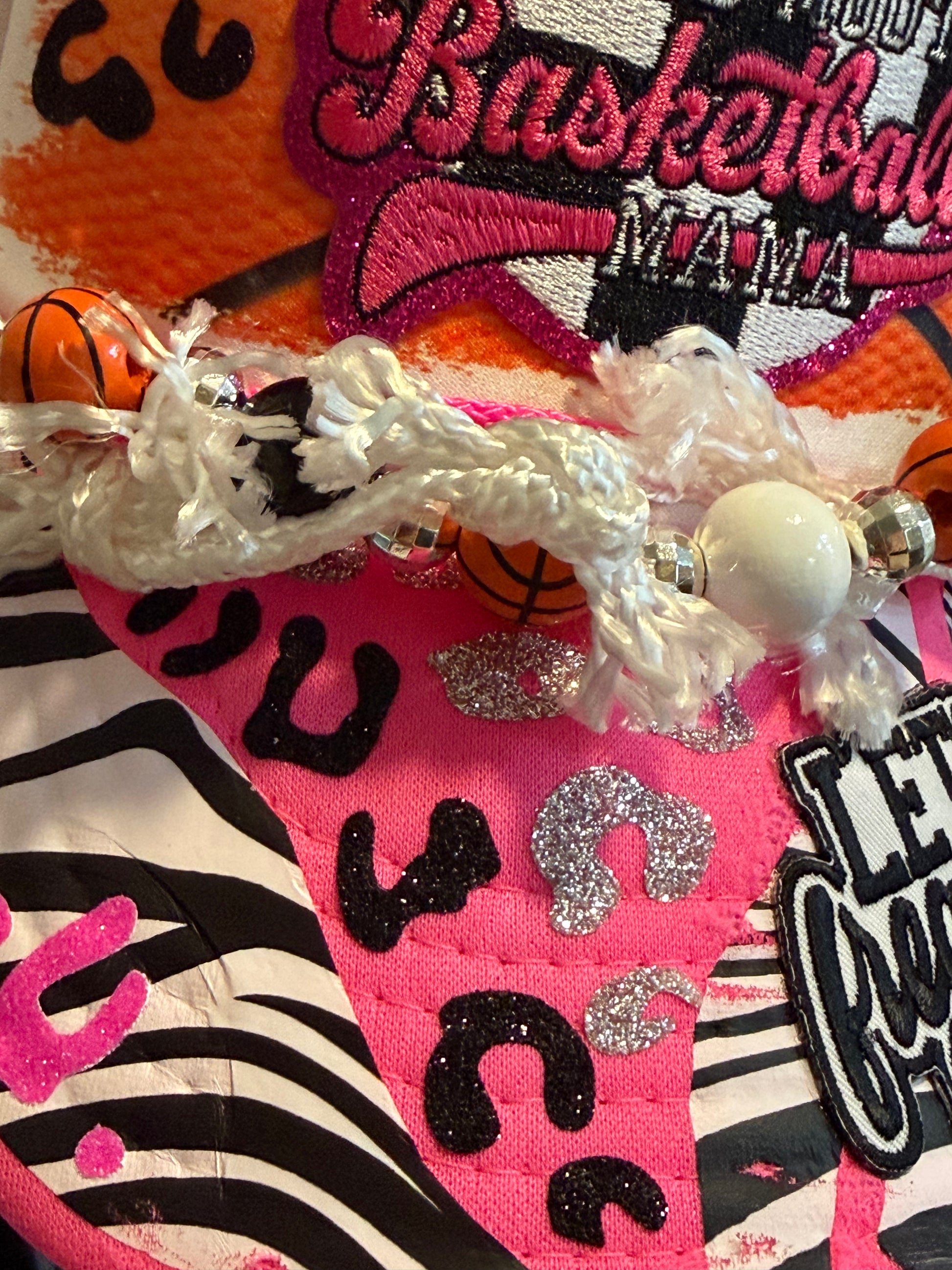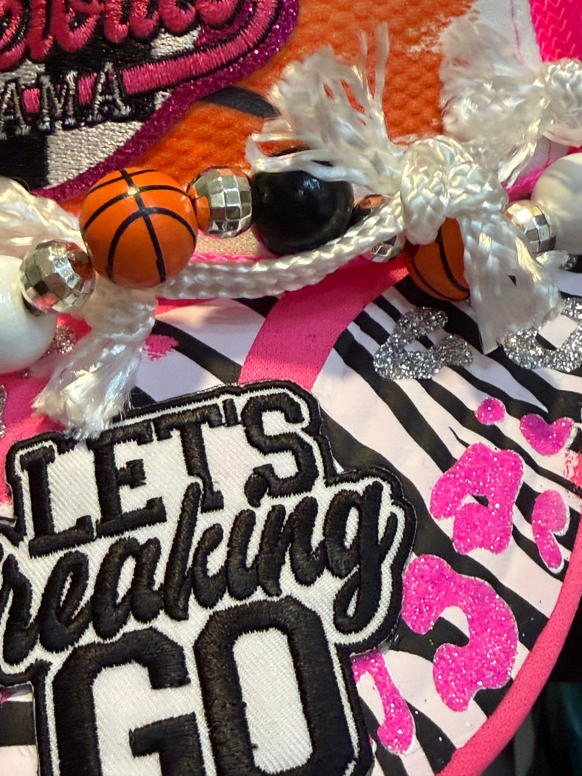 neon pink and white trucker with a bold basketball background design, leopard print, zebra print and custom chain and net detail.