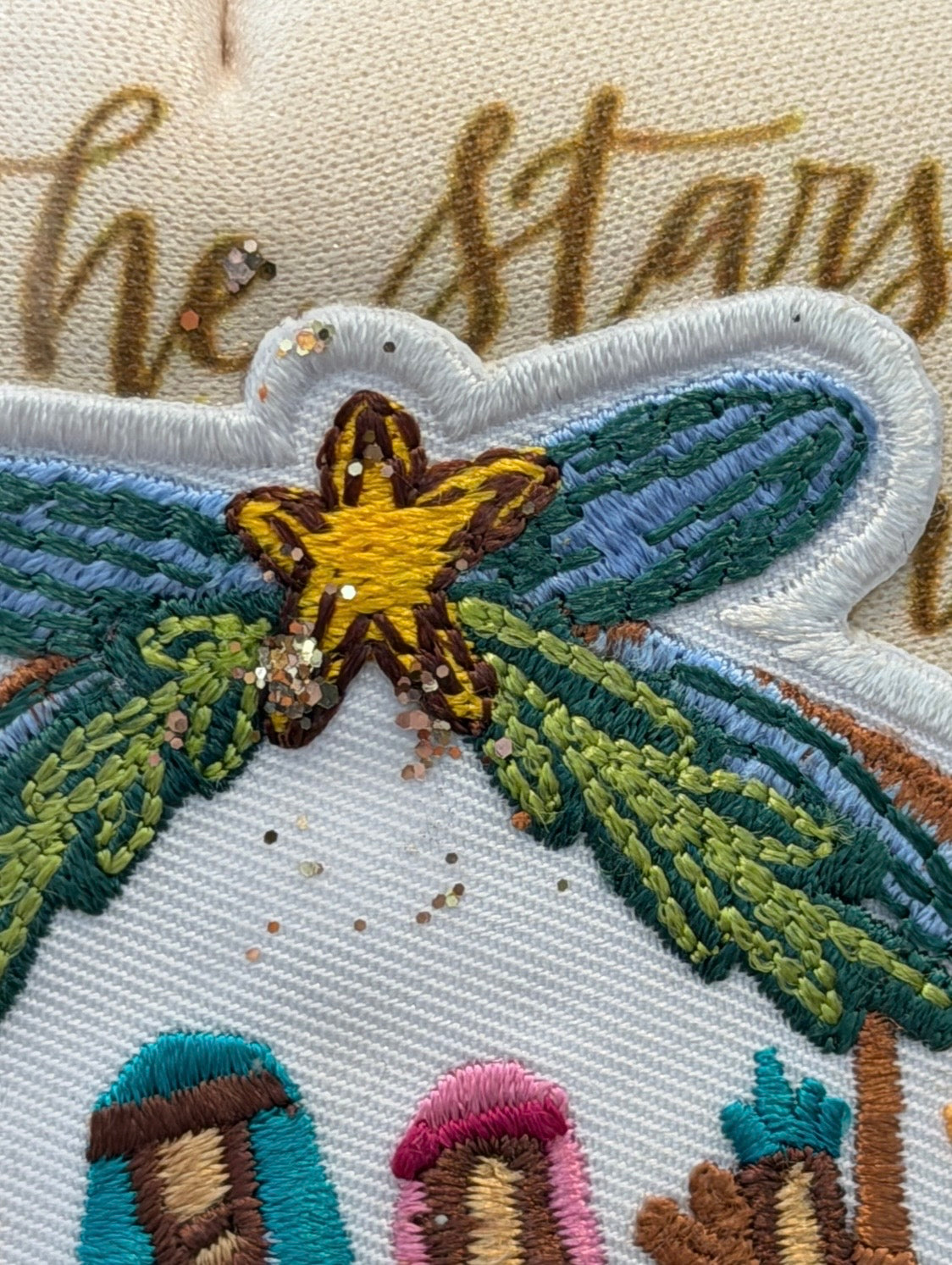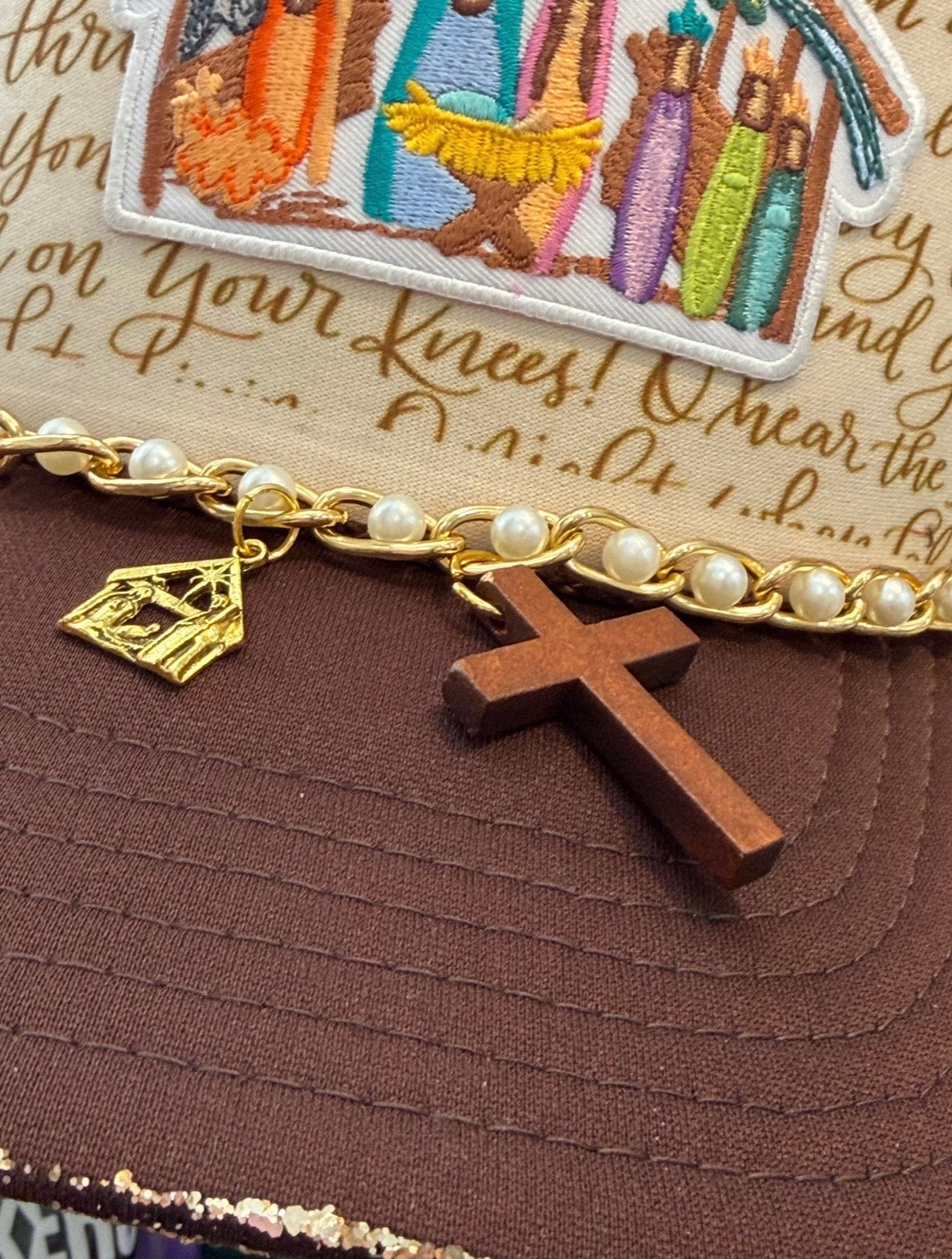 This brown and tan nativity trucker hat is the heart of Christmas and the reason for the season. This trucker hat features oh holy night lyrics across the background with a beautiful nativity scene embroidered patch. It’s hand painted in a gold accents with Pearl chain with a cross and nativity charm.