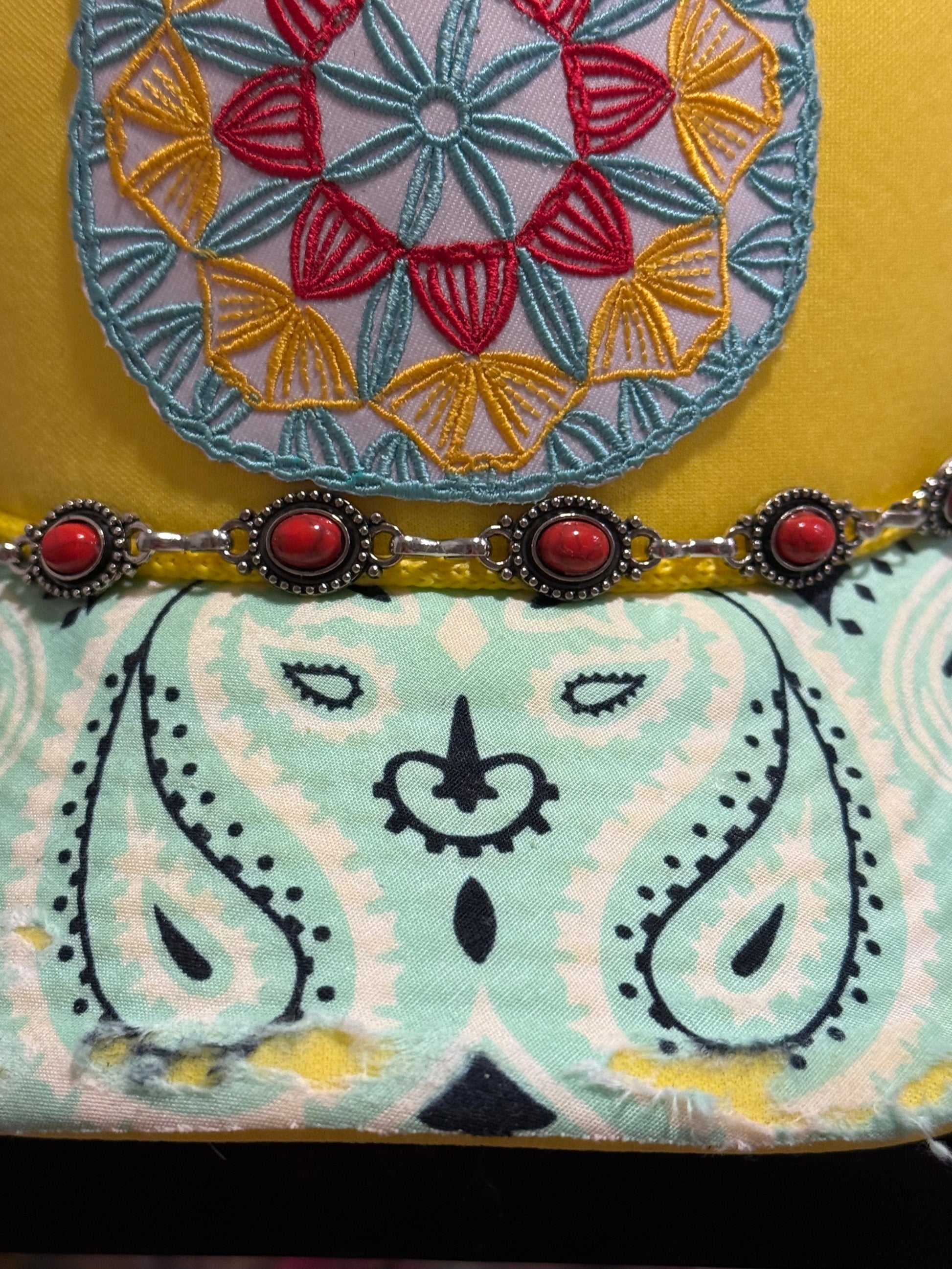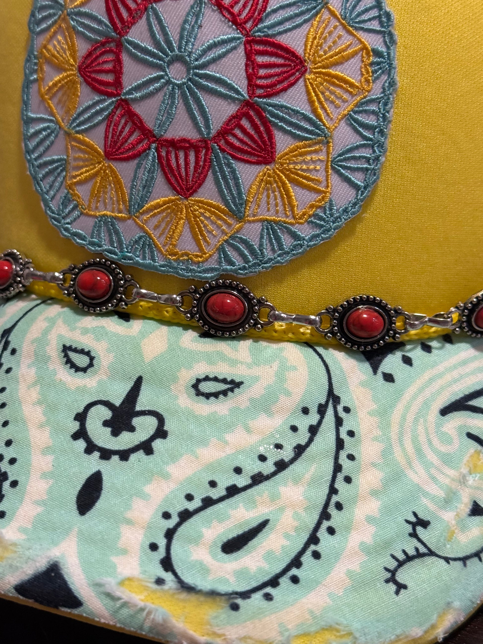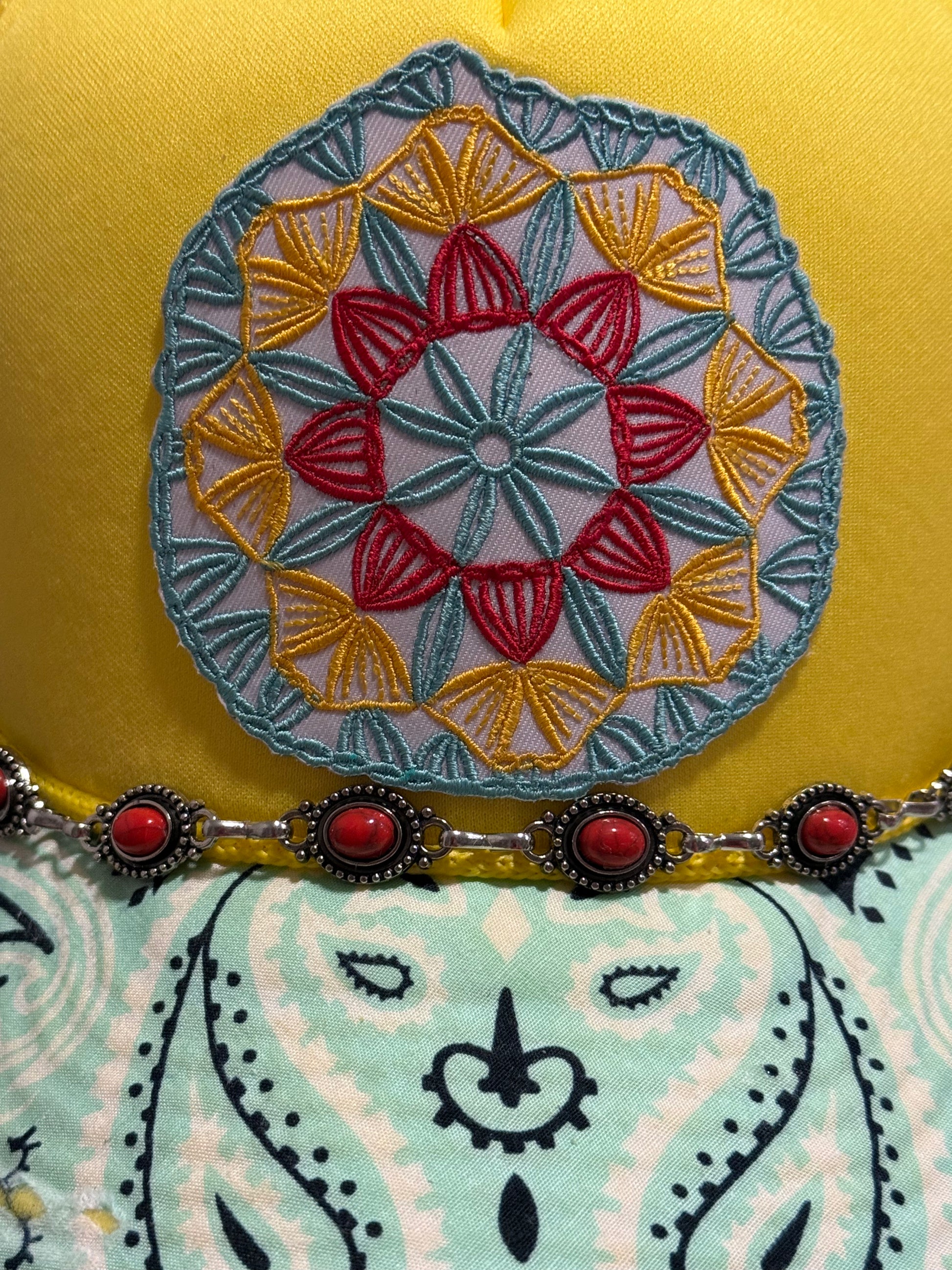 This vibrant yellow stunner is bringing all the boho heat! With a colorful mandala-inspired patch, coral gemstone chain, and that worn-in bandana brim magic, she’s made for the bold souls who don’t just chase the sun—they are the sun.