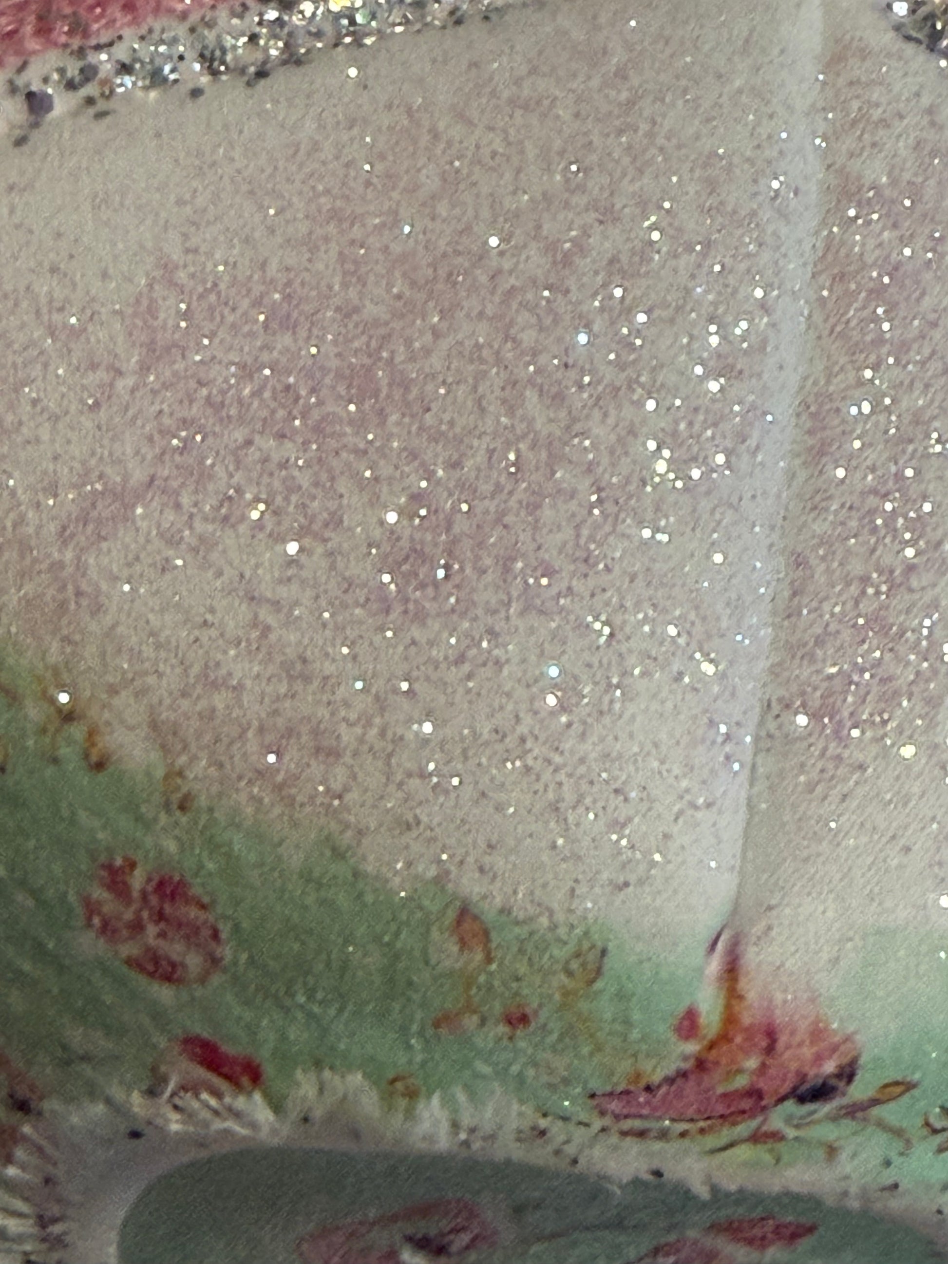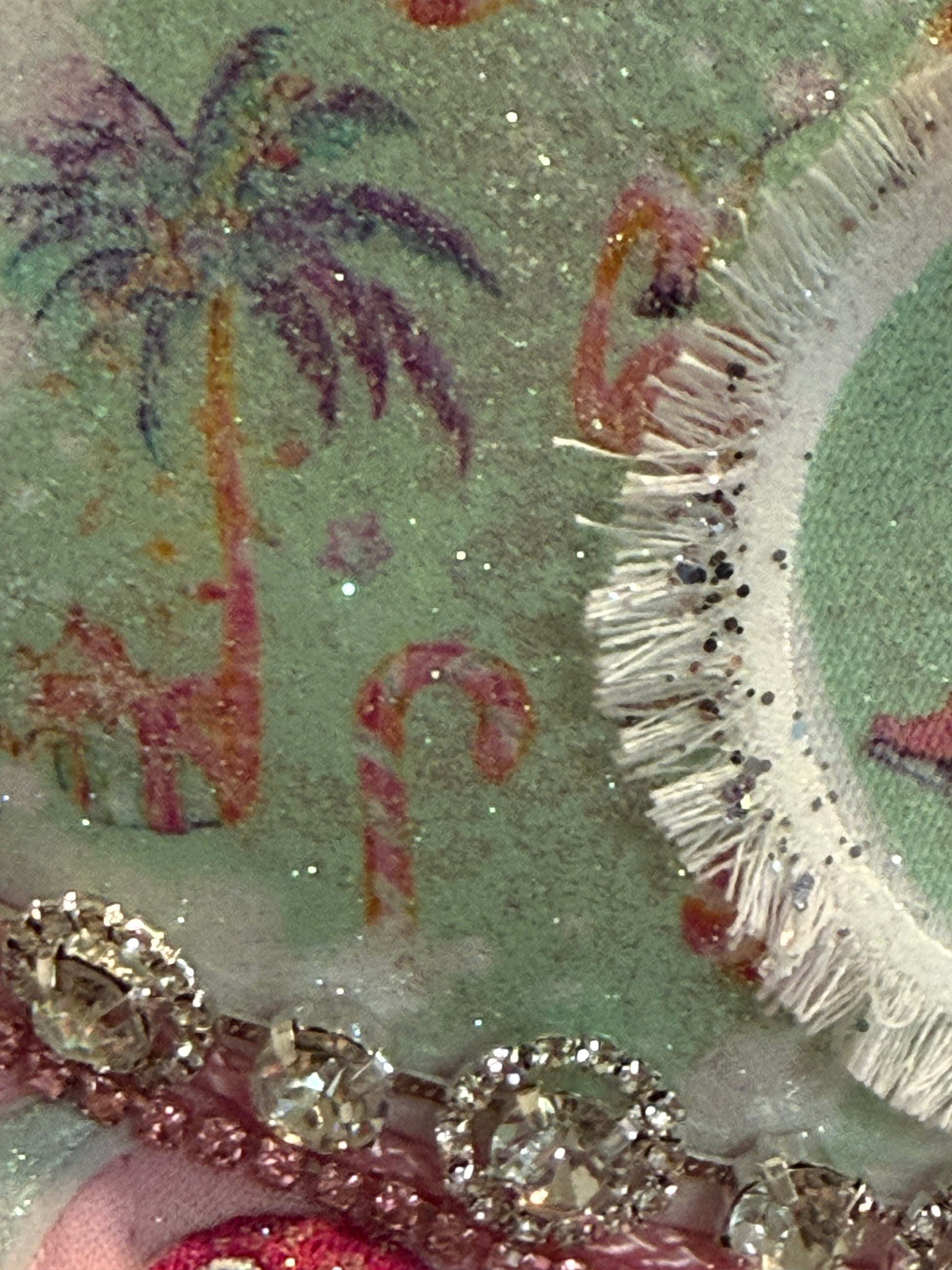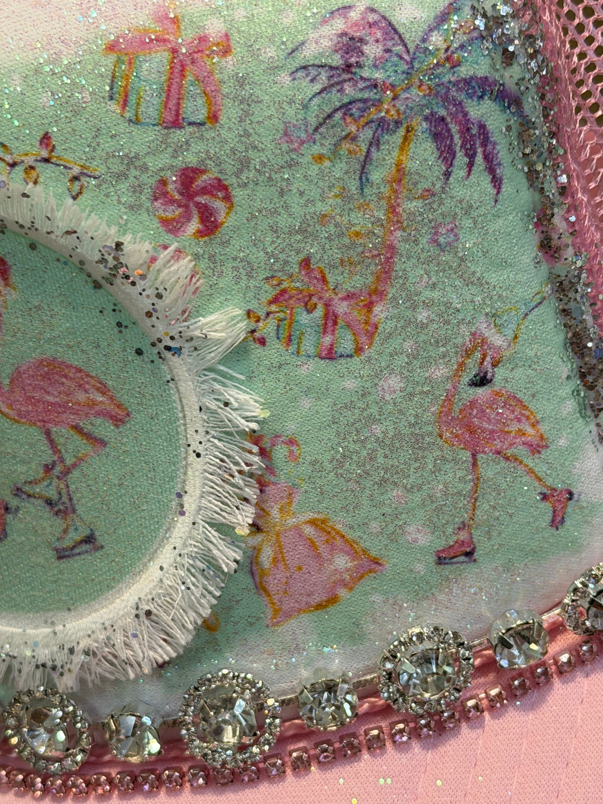 Bring the beach to your holiday season with this Blu Coconut Signature Hat! Featuring sparkling pink flamingos, shimmering glitter, rhinestine bling, custom chain, and a touch of hand painted glittery tropical cheer — it’s the perfect mix of beach vibes and Christmas sparkle!